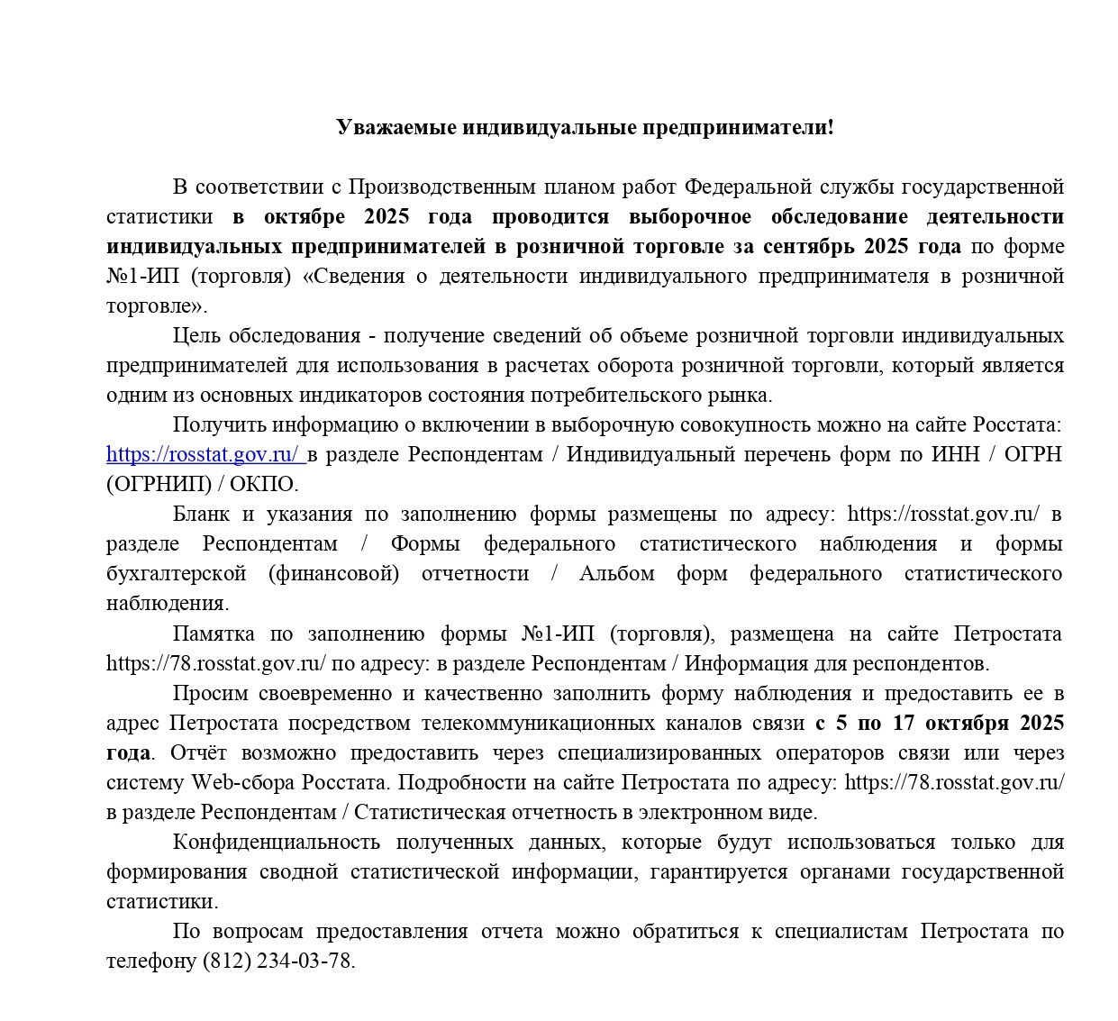 Объявление Петростата о сдаче отчетности по форме № 1-ИП (торговля) «Сведения о деятельности индивидуального предпринимателя в розничной торговле»