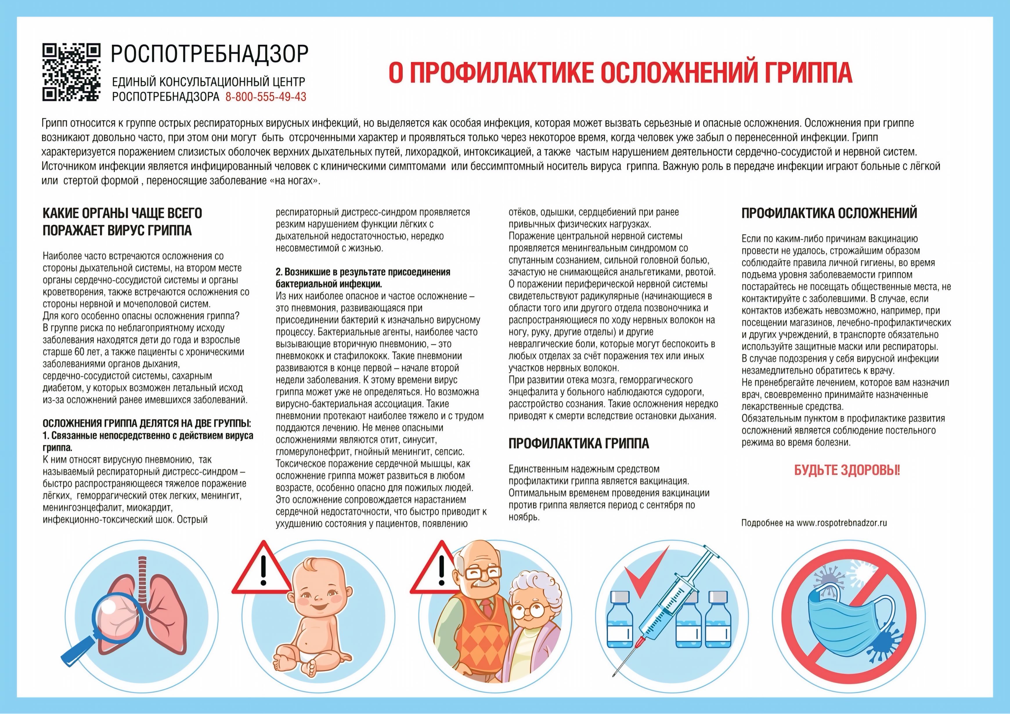 Роспотребнадзор напоминает, что в Российской Федерации продолжается кампания по бесплатной вакцинации от гриппа. Это заболевание чревато серьезными осложнениями, например, пневмонией и синуситом, а также может привести к усугублению хронических патологий, особенно сердечно-сосудистой системы.