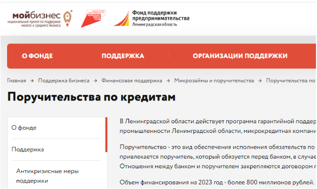 Подробнее о поручительствам и других финансовых мерах поддержки можно узнать на сайте Фонда поддержки предпринимательства Ленинградской области.