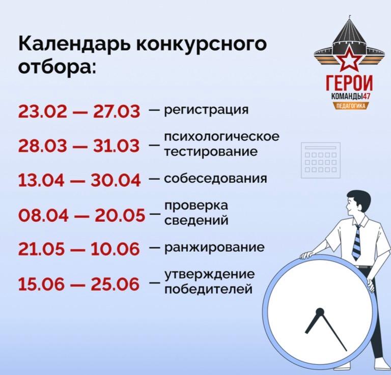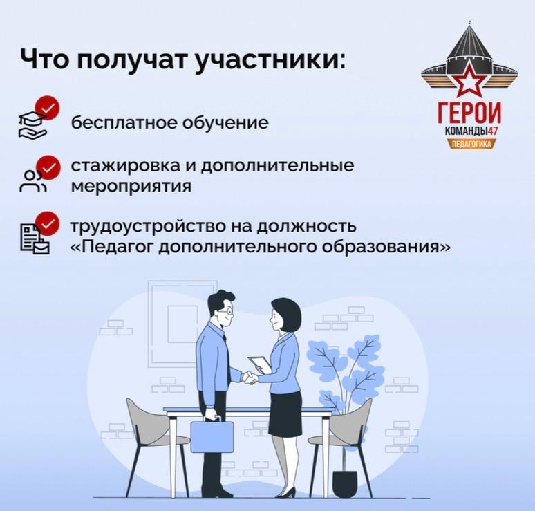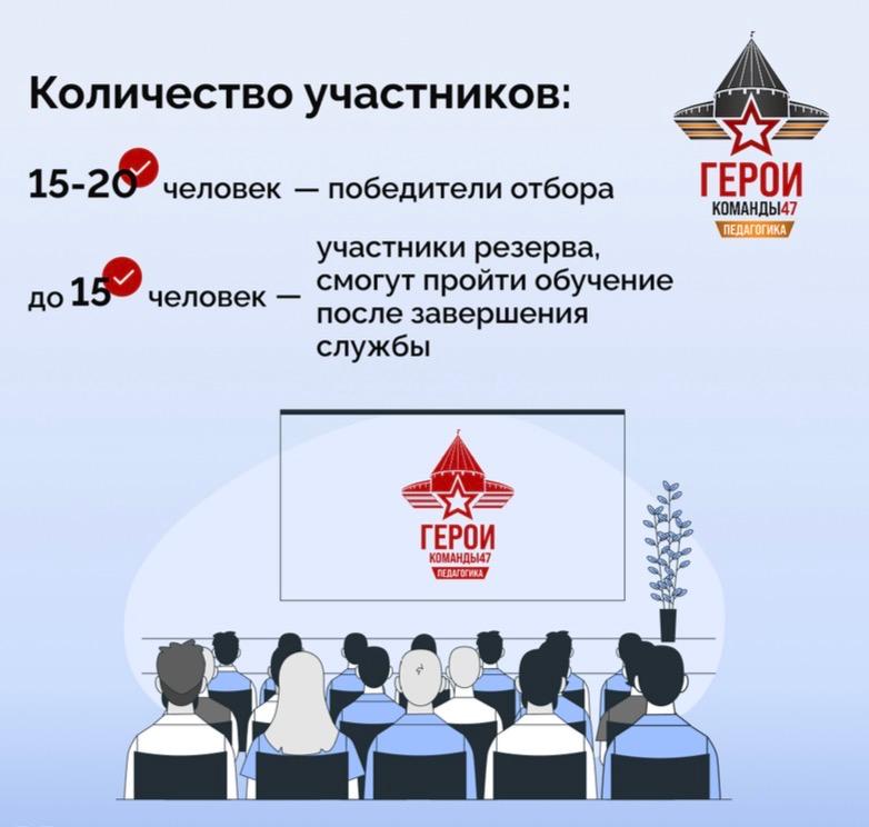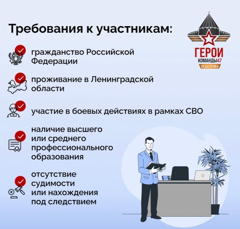 В соответствии с решением Общественного совета по реализации программы Ленинградской области «Герои Команды 47» (далее – программа) с 23 февраля 2026 года запущен прием заявок на участие в конкурсном отборе второго потока программы по направлению «Педагогика» для участников и ветеранов специальной военной операции.