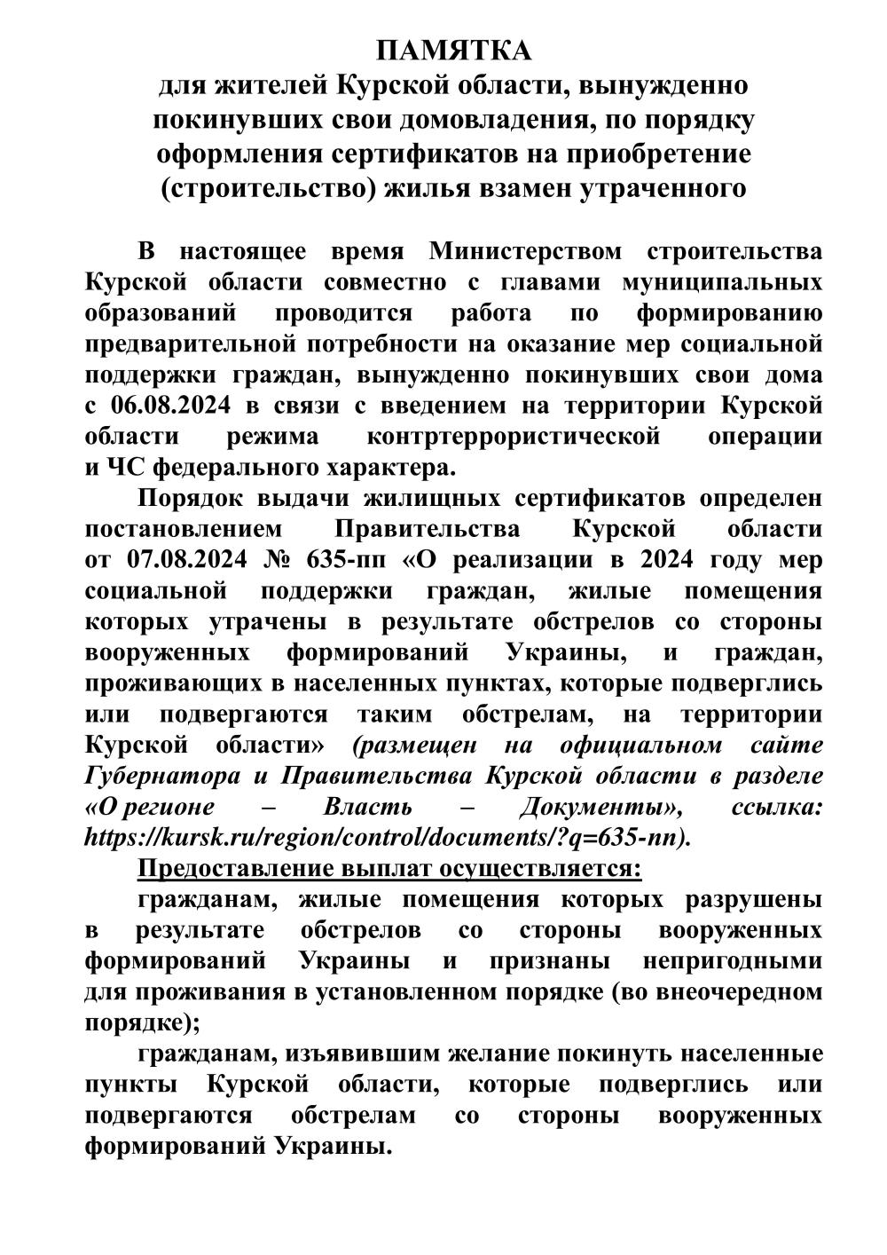 Памятка (ИТОГ) по порядку оформления сертификатов на приобретение (строительство) жилья взамен утраченного
