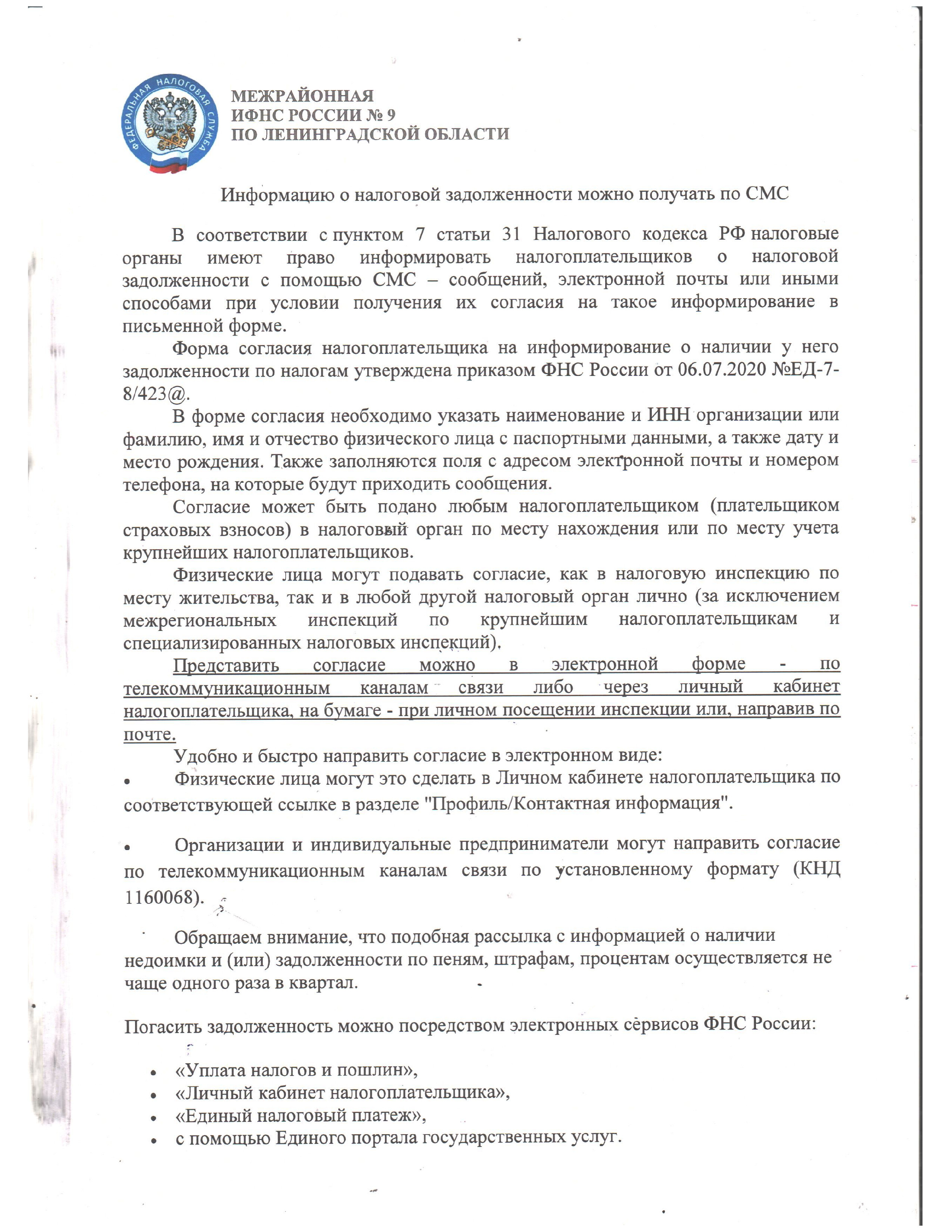 Информация от МИФНС РОССИИ о том, что налоговую задолженность можно получать по СМС