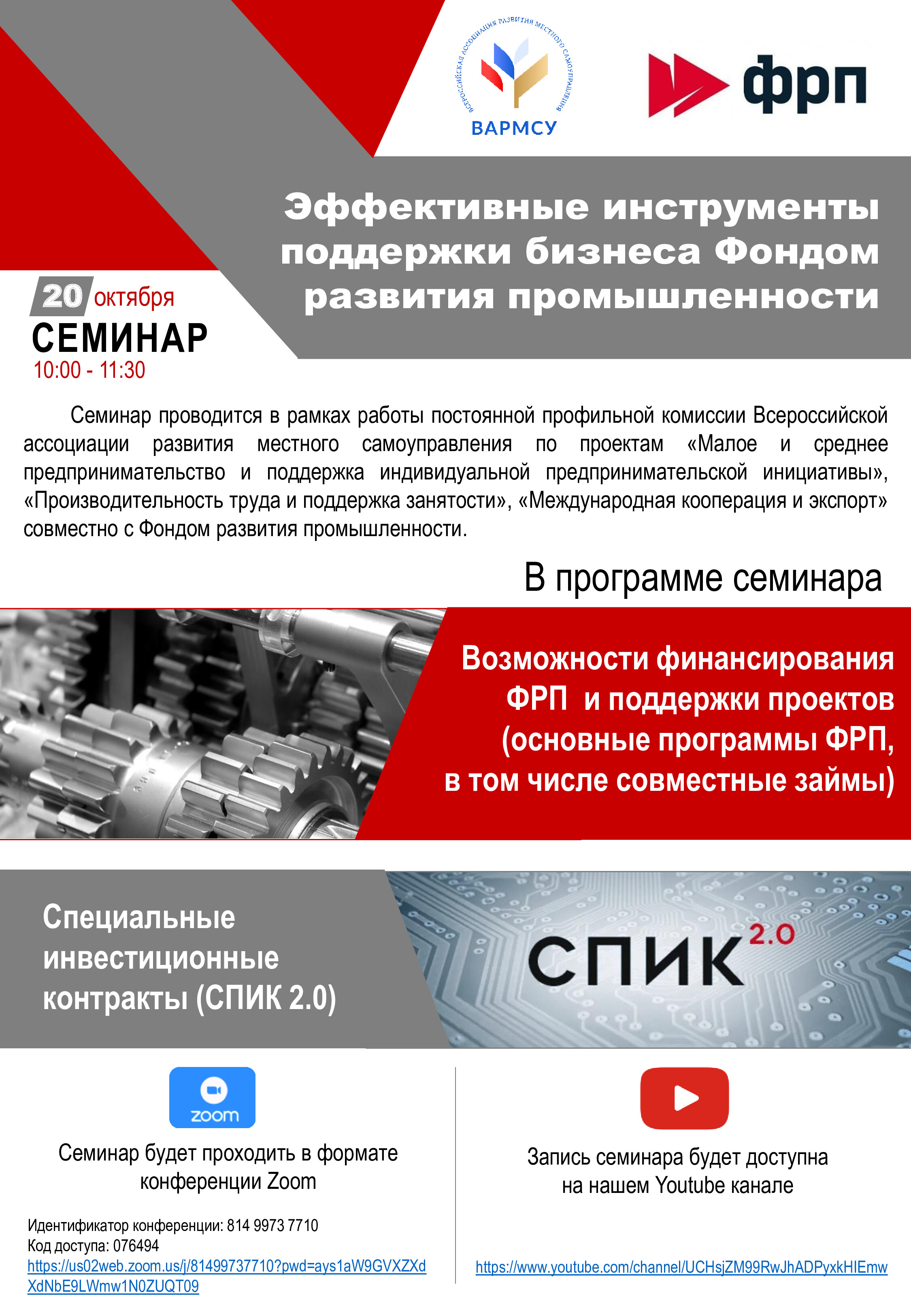 Семинар будет проводится совместно с Фондом развития промышленности в рамках работы постоянной профильной комиссии Всероссийской ассоциация развития местного самоуправления по проектам «Малое и среднее предпринимательство и поддержка индивидуальной предпринимательской инициативы», «Производительность труда и поддержка занятости», «Международная кооперация и экспорт».