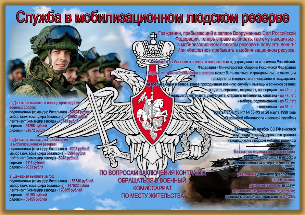 В соответствии с Постановление Правительства Российской Федерации от 03.09.2015 года № 933 «Об утверждении Положения «О порядке пребывания граждан Российской Федерации в мобилизационном людском резерве» объявлен набор граждан пребывающих в запасе в мобилизационный людской резерв. Мобилизационный людской резерв — это часть граждан, пребывающих в запасе, которые содержится в наиболее мобготовом состоянии, то есть это гражданские люди, добровольно заключившие контракт. По его условиям они в мирное время участвуют в занятиях и сборах, а при мобилизации самостоятельно прибывают в свою воинскую часть. Особенность условий контракта является возможность совмещать основную гражданскую работу с военными занятиями и сборами.